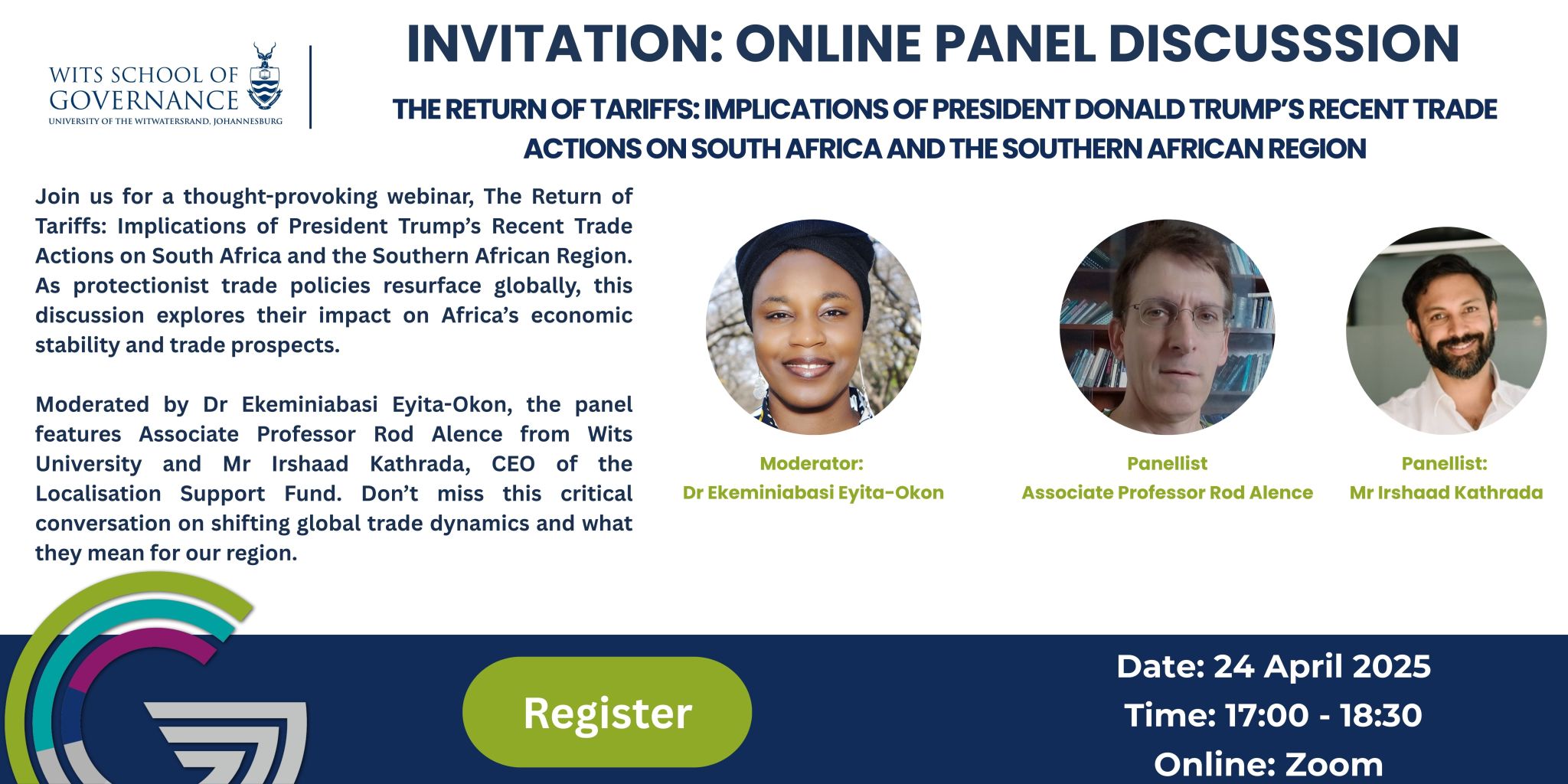 Join us at the Wits School of Governance for a thought-provoking webinar, The Return of Tariffs: Implications of President Trump’s Recent Trade Actions on South Africa and the Southern African Region. As protectionist trade policies resurface globally, this discussion explores their impact on Africa’s economic stability and trade prospects. Moderated by Dr Ekeminiabasi Eyita-Okon, the panel features Associate Professor Rod Alence from Wits University and Mr Irshaad Kathrada, CEO of the Localisation Support Fund. Don’t miss this critical conversation on shifting global trade dynamics and what they mean for our region. This event will take place on 24 April 2025 at 17:00 on Zoom.